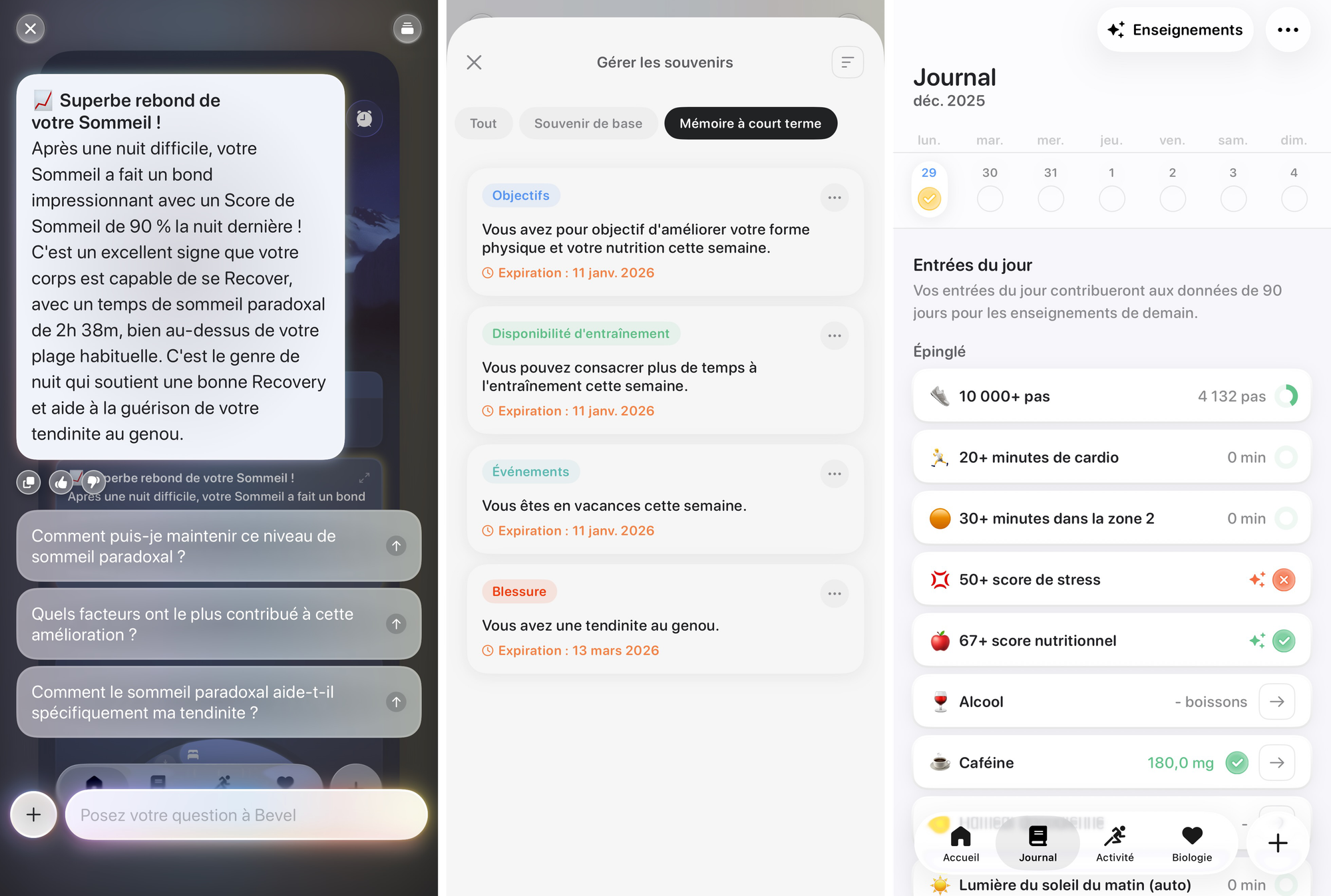 Et tout cela est gratuit. Oui, gratuit depuis quelques jours. On peut alors se demander comment l'équipe (ils sont nombreux) peut se rémunérer. Évidemment il y a bien un abonnement (59,99 /an, partagé pour toute la famille). Cet abonnement apporte des fonctions d'IA présentes un peu partout dans l'application. Elles permettent d'analyser les données, présenter des synthèses, des tendances et des conseils. Vous pouvez plonger encore plus profondément dans vos données pour en analyser les liens grâce à un chat accessible dans l’ensemble de l’application. Il est alors possible d’entrer en discussion avec ses données pour les comprendre ou définir comment améliorer tel ou tel aspect de sa santé. Vous pouvez indiquer dans le chat vos sensations, vos attentes, si vous êtes blessé. Il y a une base de données des "Souvenirs" que l'IA de Bevel peut utiliser pour adapter ses recommandations. Chaque souvenir est totalement modifiable, en particulier la date d'expiration. En voici quelques exemples concrets de mon utilisation. J'ai indiqué à Bevel que j'avais une tendinite au genou. J’ai également indiqué que j’étais en congé cette semaine et que j’étais donc plus disponible pour m’occuper de ma forme et de ma nutrition.