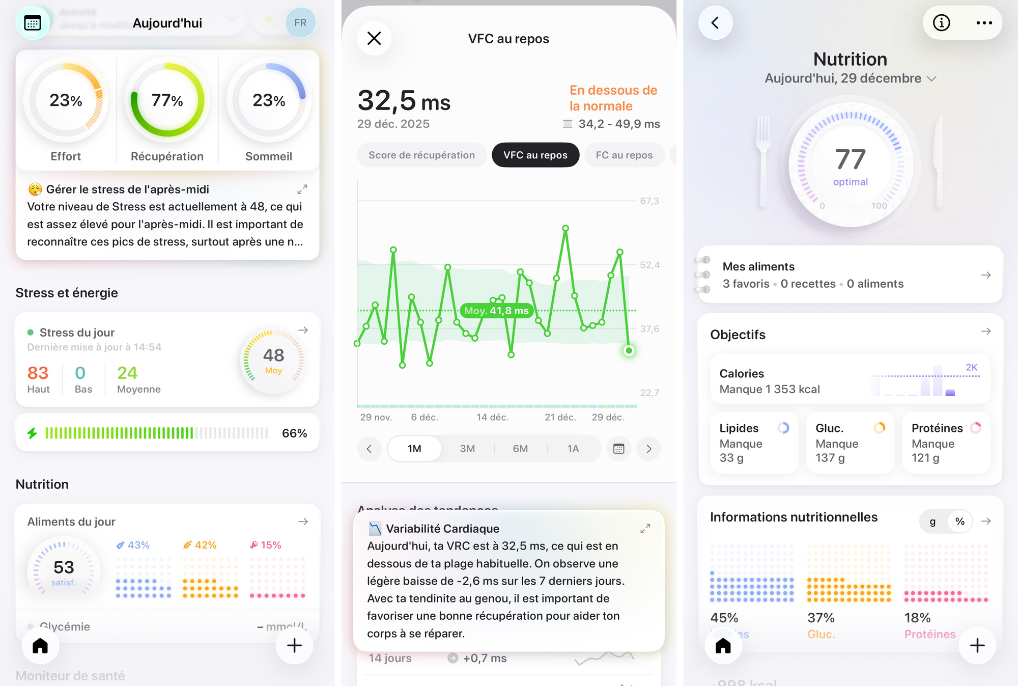 Bevel analyse ces informations pour vous présenter des analyses de votre niveau d’entrainement du jour, votre récupération, la qualité de votre sommeil, votre score de nutrition, le niveau de stress et d’énergie disponible, etc. Il est possible d’approfondir chacun de ces métriques avec des données détaillées et des graphiques. Le tout est superbement mis en forme.