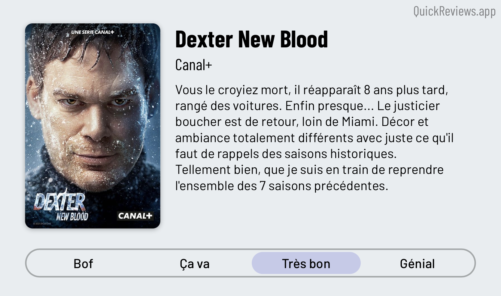 J’inaugure un nouveau format d’article pour partager mon avis rapide sur des films, séries, livres, albums… Pour cela j’utilise l’excellent outil crée par Matt Birchler.