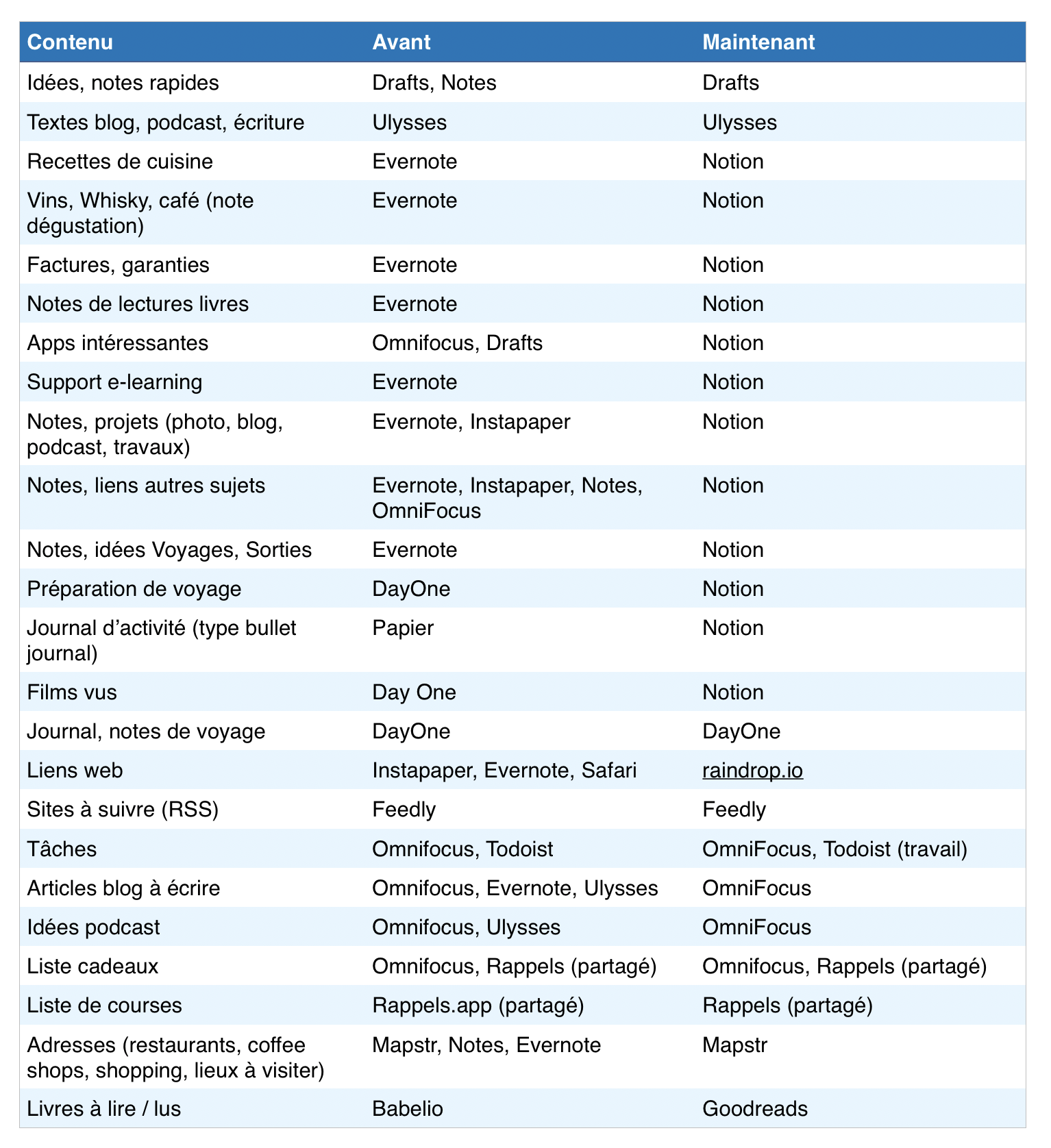 Il suffit de regarder le comparatif des apps que j’utilisais avant (il y a un tableau détaillé dans mon premier article) et les outils actuels :